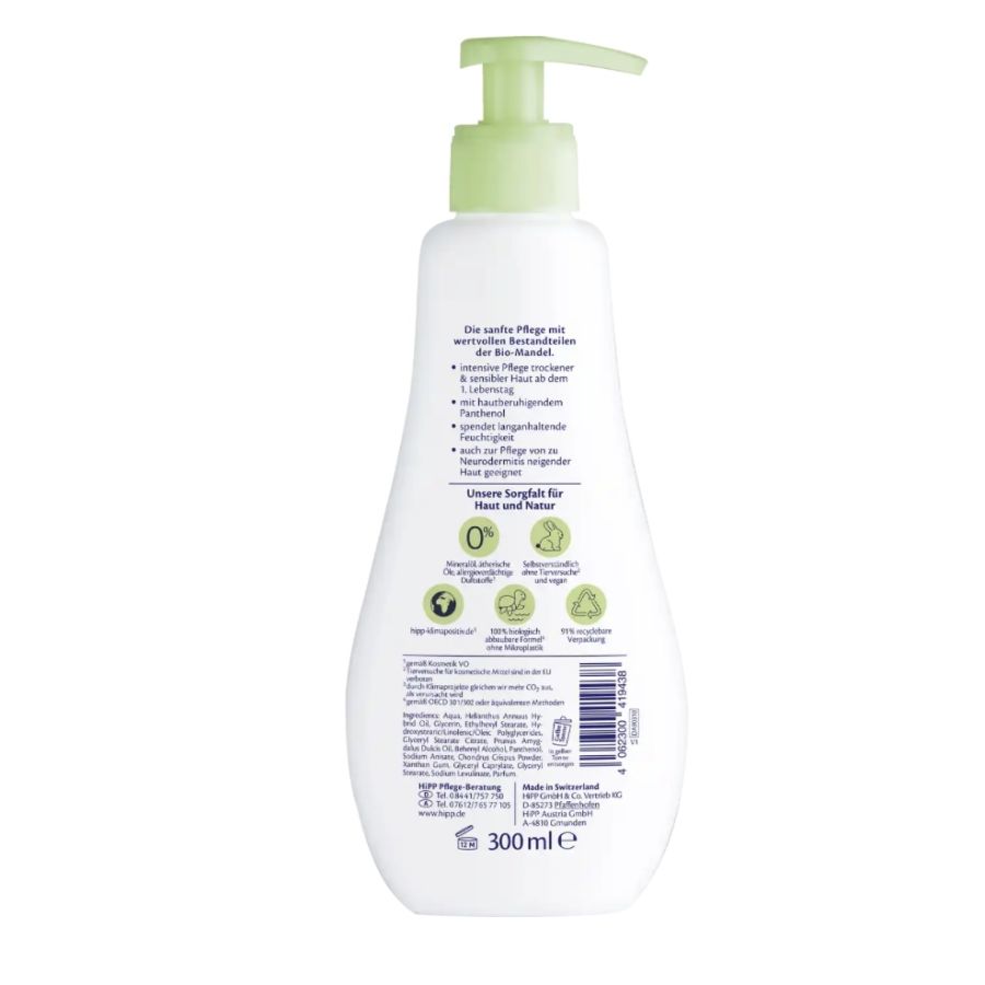 HiPP Babysanft – τώρα πιο ήπιο και πιο βιώσιμο από ποτέ. Η πλούσια λοσιόν σώματος με βιολογικό αμυγδαλέλαιο και καταπραϋντική πανθενόλη θρέφει εντατικά το ξηρό και τραχύ δέρμα. Κατάλληλο από την πρώτη μέρα της ζωής και για δέρμα με τάση για νευροδερματίτιδα. Παρέχει υγρασία που διαρκεί. 0% μικροπλαστικά, parabens και ορυκτέλαιο. Συνταγή βιοδιασπώμενη*, συσκευασία ανακυκλώσιμη και θετική για το κλίμα**.