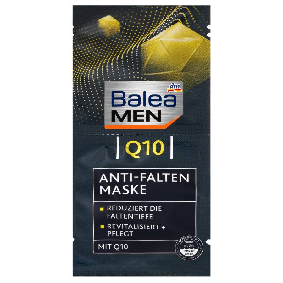 Η αντιρυτιδική μάσκα Balea MEN Q10 θρέφει και αναζωογονεί την απαιτητική ανδρική επιδερμίδα. Η ειδική φόρμουλα περιποίησης με Q10 και υαλουρονικό οξύ παρέχει εντατική και μακροχρόνια υγρασία. Ταυτόχρονα, μειώνεται το αίσθημα έντασης και μειώνεται το βάθος των ρυτίδων με την τακτική χρήση. Η βιταμίνη Ε υποστηρίζει επίσης την προστασία του δέρματος από τις περιβαλλοντικές επιδράσεις που σχετίζονται με την υπεριώδη ακτινοβολία. Για μια φρέσκια και ζωτική εμφάνιση. Συνταγή χωρίς μικροπλαστικά και υδατοδιαλυτά, αμιγώς συνθετικά πολυμερή.