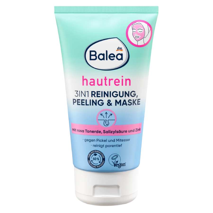 Ο καθαρισμός προσώπου Balea hautrein 3 σε 1 συνδυάζει έναν γρήγορο καθαρισμό, ένα peeling και μια μάσκα σε ένα προϊόν. Η φόρμουλα εμπλουτισμένη με ροζ άργιλο, σαλικυλικό οξύ και ψευδάργυρο καθαρίζει βαθιά τους πόρους. Για εντατικό και ευχάριστο καθάρισμα – μέρα με τη μέρα. Συνταγή χωρίς μικροπλαστικά και υδατοδιαλυτά, αμιγώς συνθετικά πολυμερή.