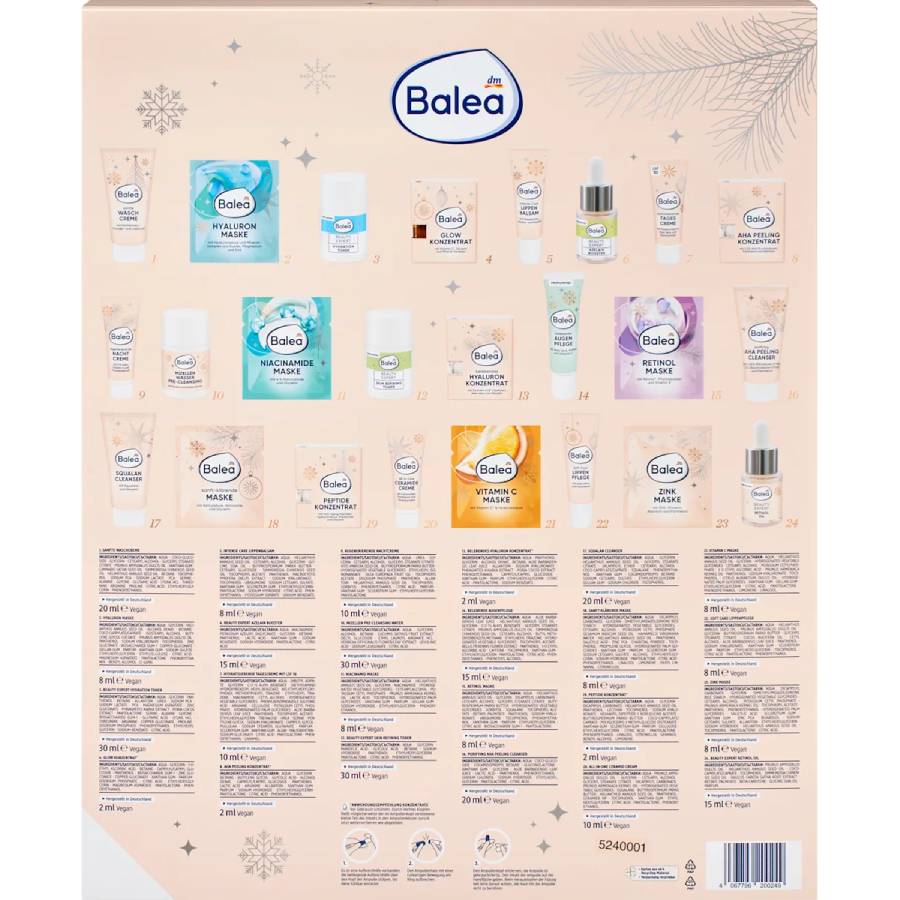 Ποικίλα, εμπνευσμένα προϊόντα περιποίησης Για μια αίσθηση περιποίησης και αναζωογόνησης στην επιδερμίδα Ιδανικό ως ιδέα δώρου για τους λάτρεις της ομορφιάς Με το Ημερολόγιο Advent Προσώπου Balea, η καθημερινή σας ρουτίνα περιποίησης της επιδερμίδας γίνεται μια ξεχωριστή εμπειρία ενόψει των Χριστουγέννων. Κρυμμένη στις 24 πόρτες του βρίσκεται μια ποικιλία από ενεργά καλλυντικά προϊόντα, που κυμαίνονται από συμπύκνωμα απολέπισης AHA και αναζωογονητικό συμπύκνωμα υαλουρονικού οξέος έως έλαιο ρετινόλης και κρέμα κεραμιδίου. Ο συνδυασμός καθαρισμού, ενυδάτωσης και μάσκας περιποιείται την επιδερμίδα σας μέρα με τη μέρα, παρέχοντας νέα έμπνευση για να εμπλουτίσετε την προσωπική σας ρουτίνα περιποίησης. Χρησιμοποιώντας υψηλής ποιότητας συστατικά όπως υαλουρονικό οξύ, πανθενόλη, νιασιναμίδη και βιταμίνη C, το ημερολόγιο προσφέρει μια ολοκληρωμένη επιλογή για διάφορες ανάγκες της επιδερμίδας. Αυτό κάνει κάθε μέρα του Δεκεμβρίου μια μικρή στιγμή περιποίησης.