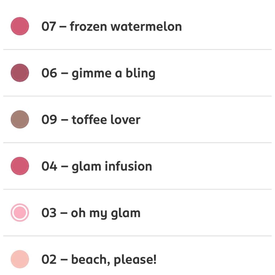 | Χρώμα | Oh my glam, Glam Infusion, Gimme a blink, Frozen Watermelon, Clear, Beach Please, Toffee Lover |