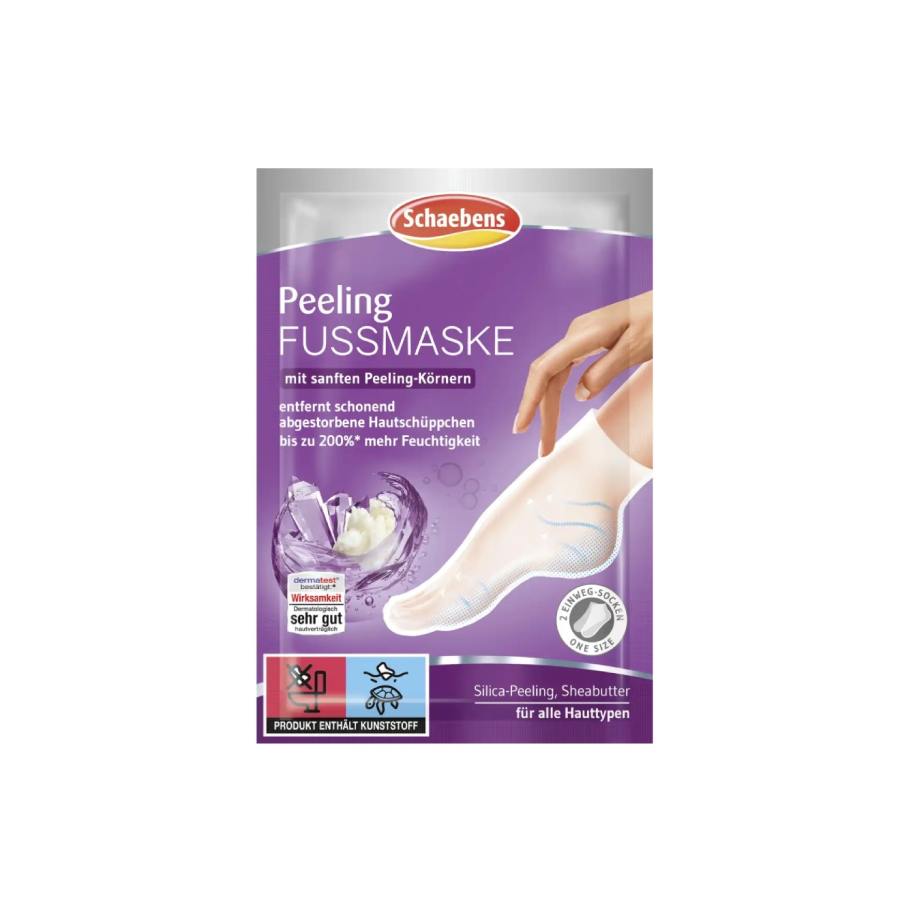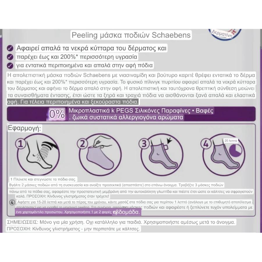 Η απολεπιστική μάσκα ποδιών Schaebens με νιασιναμίδη και βούτυρο καριτέ θρέφει εντατικά το δέρμα και παρέχει έως και 200%* περισσότερη υγρασία. Το φυσικό πίλινγκ πυριτίου αφαιρεί απαλά τα νεκρά κύτταρα του δέρματος και αφήνει το δέρμα απαλό στην αφή. Η απολεπιστική και ταυτόχρονα θρεπτική σύνθεση μειώνει τα συναισθήματα έντασης, έτσι ώστε τα ξηρά και τραχιά πόδια να αισθάνονται ξανά απαλά και ελαστικά. Για τέλεια περιποιημένα και ξεκούραστα πόδια.
