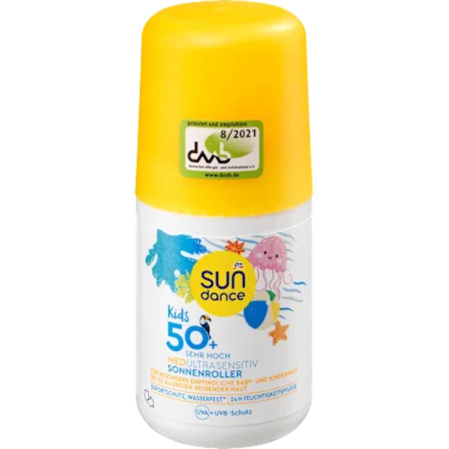 Το SUNDANCE Sun Roller Kids MED ultra sensitive SPF 50+ αναπτύχθηκε ειδικά για δέρμα επιρρεπές σε αλλεργίες. Παρέχει άμεση και αξιόπιστη προστασία από τα ηλιακά εγκαύματα με το ευρέως φάσματος σύστημα φίλτρων UVA/UVB και τη βιταμίνη Ε. Ο κύλινδρος παρέχει επίσης μακροχρόνια προστασία από την αφυδάτωση του δέρματος. Το σκούτερ ηλίου είναι ελεγμένο και συνιστάται από τη Γερμανική Ένωση Αλλεργιών και Άσθματος. . Δερματολογικά επιβεβαιωμένη συμβατότητα με το δέρμα. Αδιάβροχο* (*Ανεξάρτητο ινστιτούτο δοκιμών επιβεβαιώνει: Μετά από 40 λεπτά στο νερό, τουλάχιστον το 50% του διαφημιζόμενου παράγοντα αντηλιακής προστασίας εξακολουθεί να διατηρείται). Από σεβασμό στους ωκεανούς μας, χωρίς τα φίλτρα UV octinoxate, oxybenzone και octocrylene.